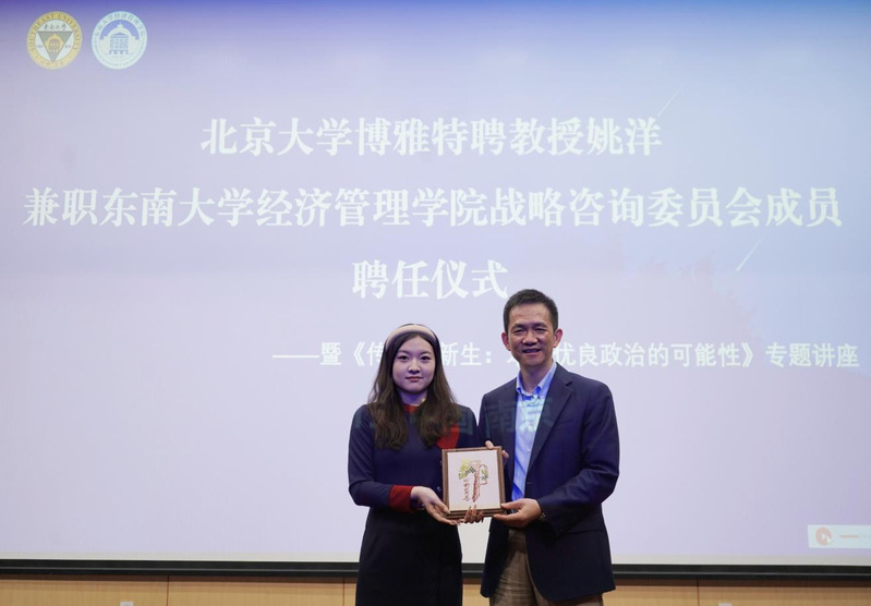 讲座后,举行了姚洋教授受聘太阳集团tyc539战略咨询委员会委员的聘任仪式。学院党委书记袁健红为其颁发聘书,并对姚洋教授长期以来对学院发展的关心与支持表示感谢。之后,学生代表也为姚洋教授送上了太阳集团tyc539特色非遗彝绣纪念品。