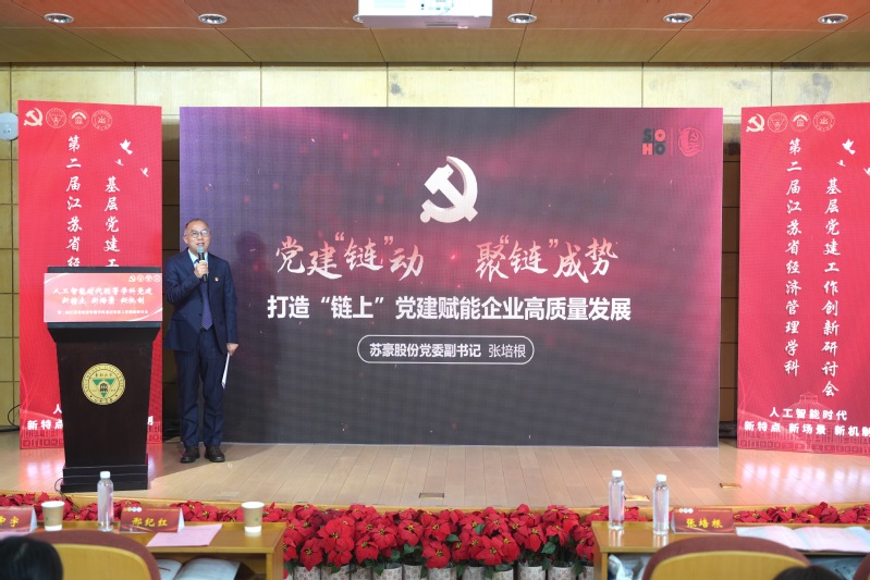 江苏苏豪国际集团股份有限公司党委副书记张培根强调了“党建链、产业链、供应链、创新链、人才链”五链融合的重要性,力求在数字化、品牌化、专业化层面打造全新苏豪股份,并分享了三点工作经验:第一,推动创建“红帆丝路,春蚕织豪”链上党建品牌,扎实构建产业链党组织体系;第二,积极践行“双链”发展战略,着力提升产业链供应链韧性和安全水平;第三,抢抓数字经济机遇赋能业态“焕新”,强链补链延链助推产业蝶变升级。
