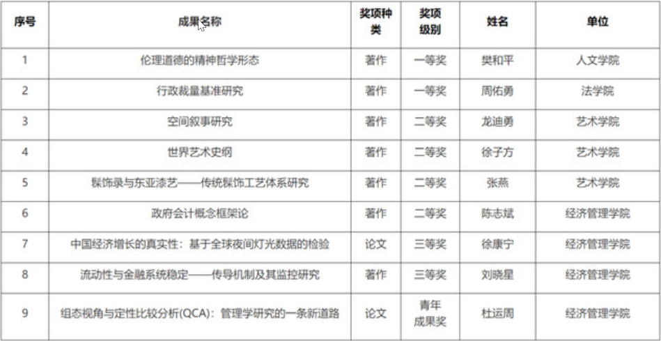The Outstanding Achievement Award for Scientific Research (Humanities and Social Sciences) in Higher Education Institutions is the highest achievement award in the social sciences category in China, and the selection is launched twice every 5 years. A total of 1,539 achievements were awarded this year, including 1,241 Book Awards with 152 first prizes, 77 Consulting Service Report Awards with 10 first prizes, 20 Popular Reading Awards, and 201 Youth Achievement Awards.