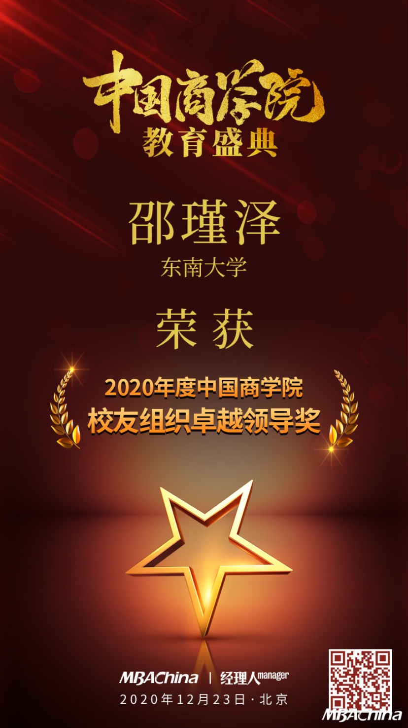 Shao Jinze, an MBA alumnus of Southeast University, won the "Chinese Business School Alumni Organization Outstanding Leadership Award in 2020". Shao Jinze is a 2018 MBA graduate of Southeast University. He was the Vice Chairman of the 11th MBA Federation of Southeast University. He is currently the Vice Chairman of the MBA Venture Capital Club of Southeast University and the Joint Secretary-General of the Jiangsu University Venture Capital Club. As the General Manager of Nanjing Nacai Enterprise Management Consulting Co., Ltd., he has made outstanding achievements in the fields of headhunting consultants and human resources management. The award of Shao Jinze is an affirmation and impetus for the achievements of our alumni at this annual ceremony.