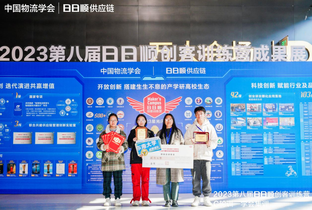 On November 19, 2023, the 8th Ririshun Maker Training Camp "C Rotation Training" - Society Training Camp ended successfully in Wuxi, Jiangsu.The project proposed by Wu Chenghui, Xue Bo, Yu Longfu, Ruan Xiaohe, and Zhang Zixuan, five undergraduates majoring in logistics management, was guided by Li Sijie, a teacher from the Department of Logistics Management Engineering of our college. Under the joint review of expert judges and enterprise tutors, the research on the Innovation of Full Chain Delivery Operation Mode Based on AI Algorithm Intelligent Decision successfully broke into the "C Rotation Training" after the enterprise research team in the links of "Seed Set", "Angel Study", "A Round Research" and "B Round Creation" set up project research and roadshow and won the 2023 Ririshun Maker Training Camp. Teacher Li Sijie from our college has been awarded the titles of "Excellent Guidance Teacher" and "Excellent Mentor", and Southeast University has been awarded the Excellent Organization Award. This is also the third time our undergraduate team has won the National Gold Award at the Ririshun Maker Training Camp.