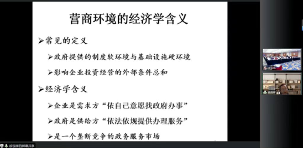 Professor Xu Xianxiang gave a keynote speech online through Tencent Conference. Firstly, the report pointed out that the business environment was "a monopolized competitive market for government services" from the perspective of economics; secondly, it analyzed that optimizing the business environment can affect business entry, total factor productivity, and industrial structure by reducing the cost of doing business, providing more government services, and then affecting business development; finally, the report further analyzed the relationship between business environment optimization and economic development, as well as the heterogeneity of local governments and their performance differences. Finally, the report further analyzed the relationship between business environment optimization and economic development, as well as the heterogeneity of local governments in optimizing business environments and their performance differences.